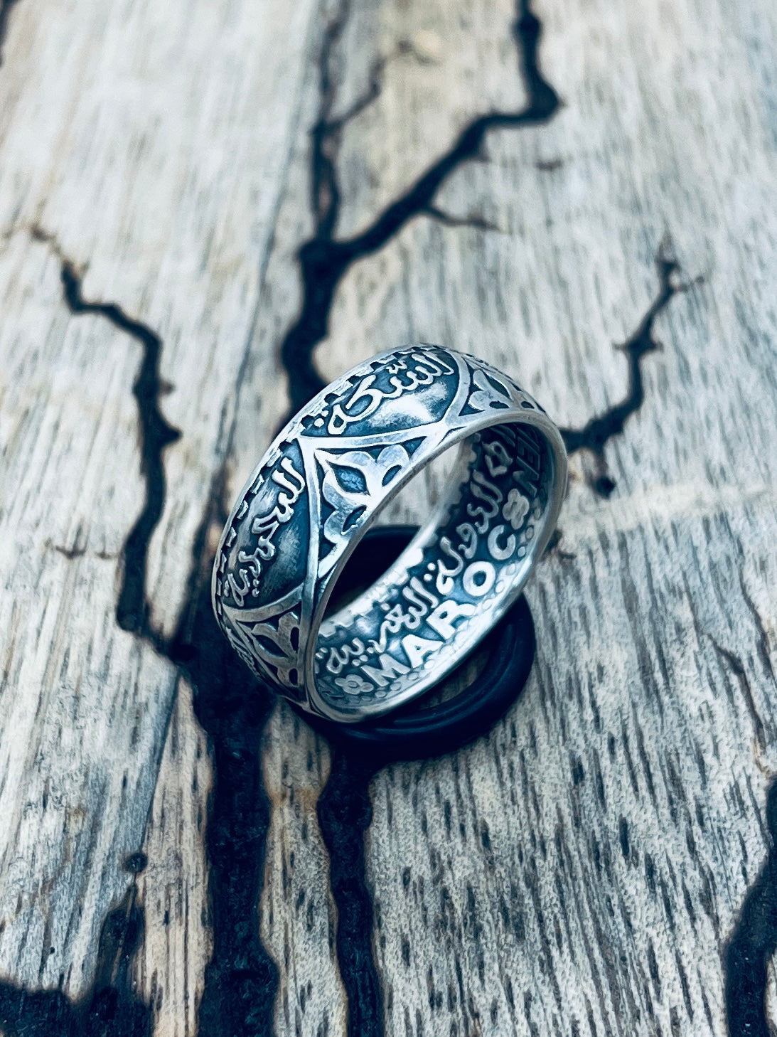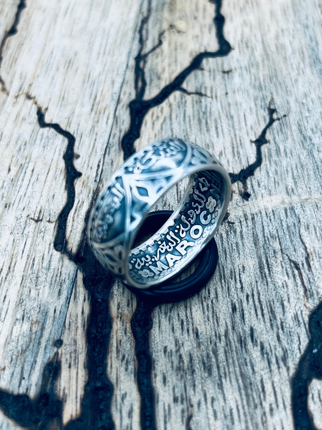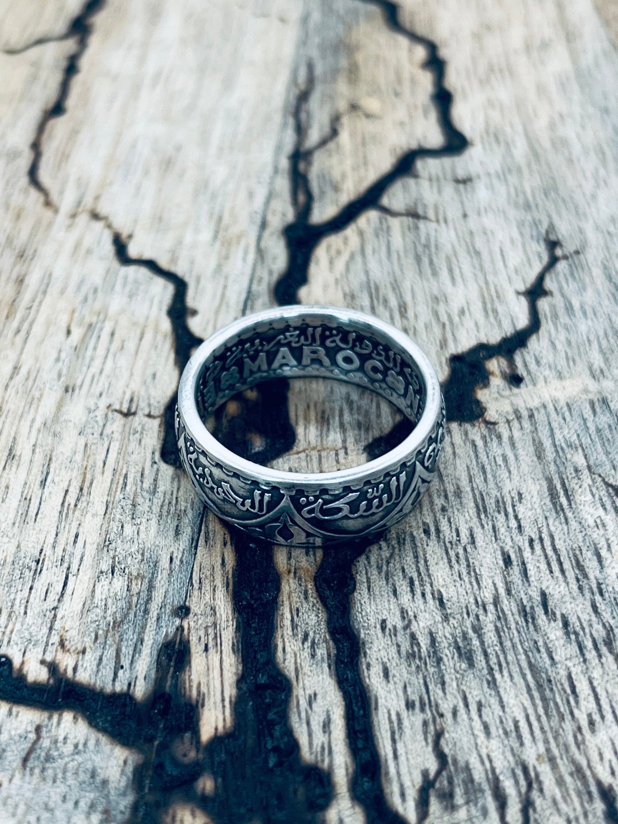 Handgefertigt aus einer alten, marokkanischen Silbermünze (200 Francs, 0,720er Silber)! Mit diesem Silberring trägt man ein Stück marokkanische Geschichte am Finger.