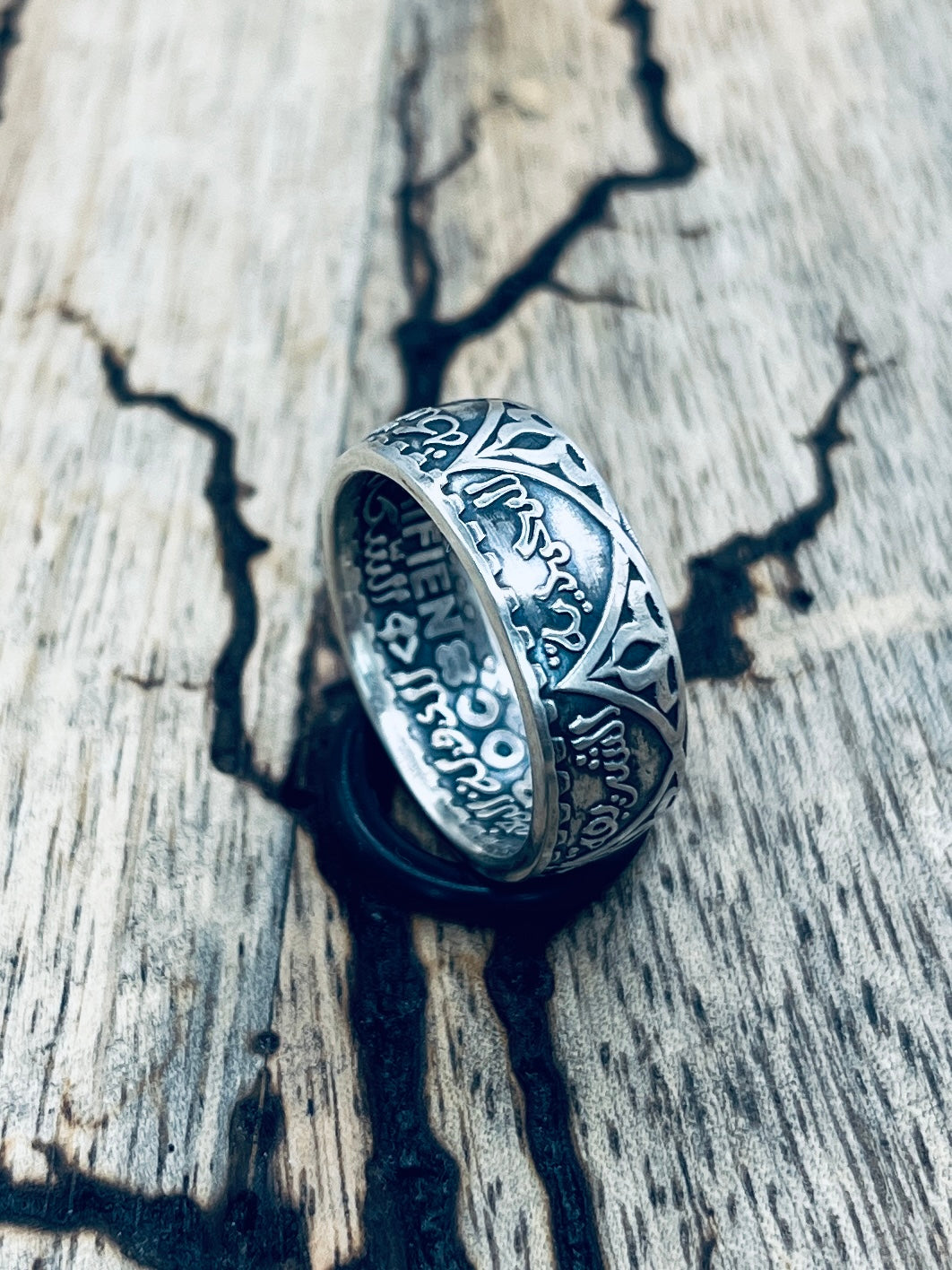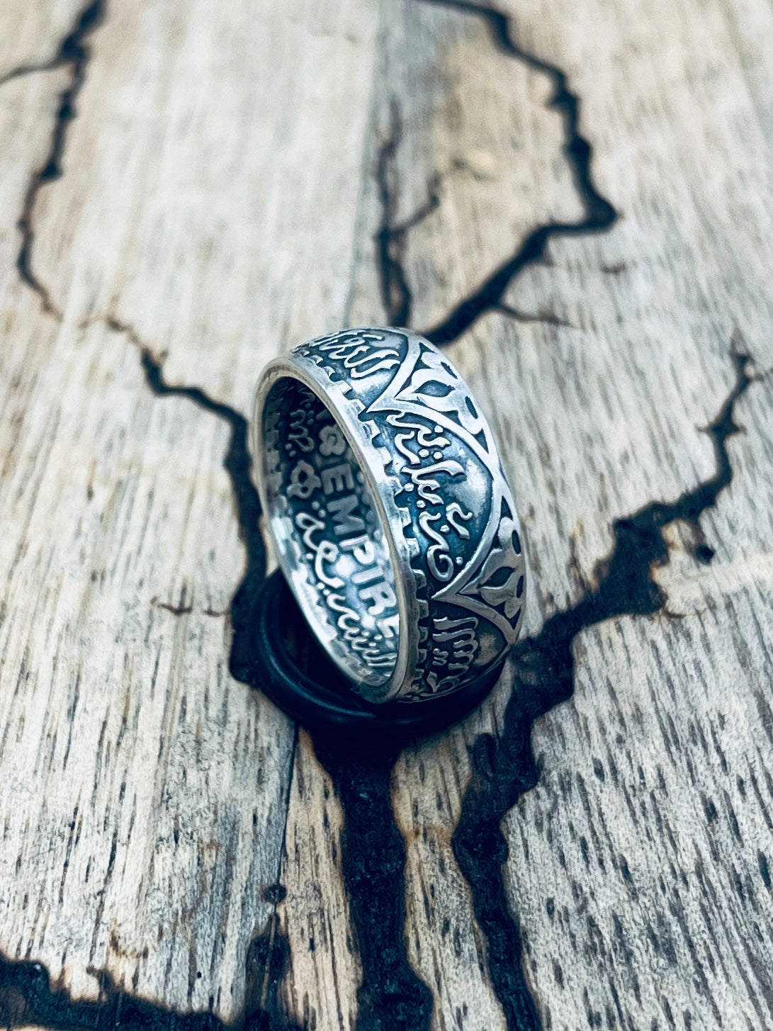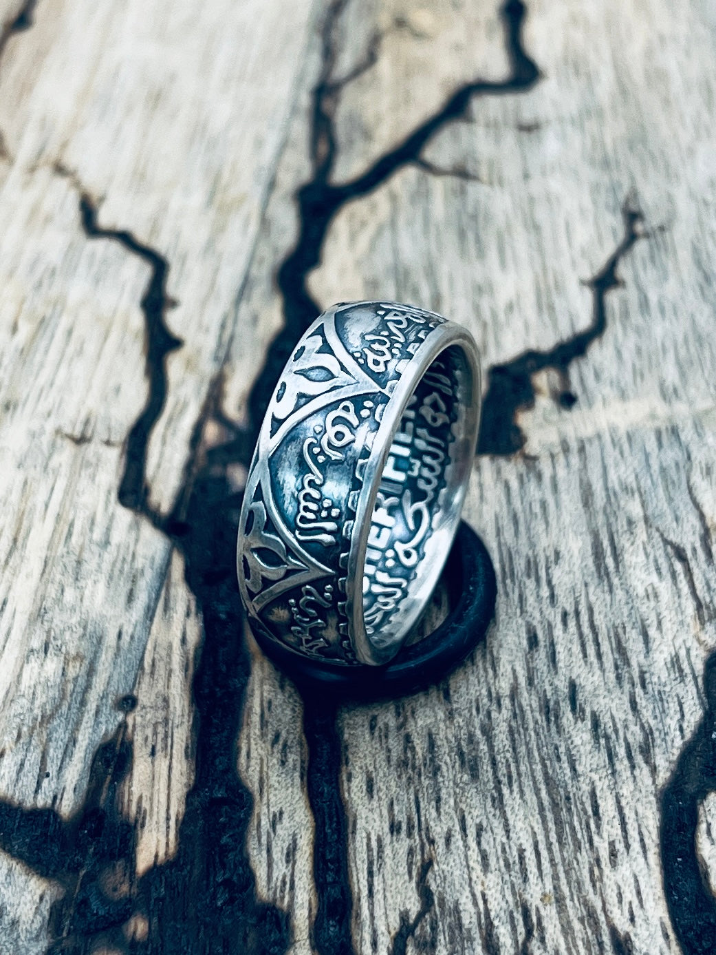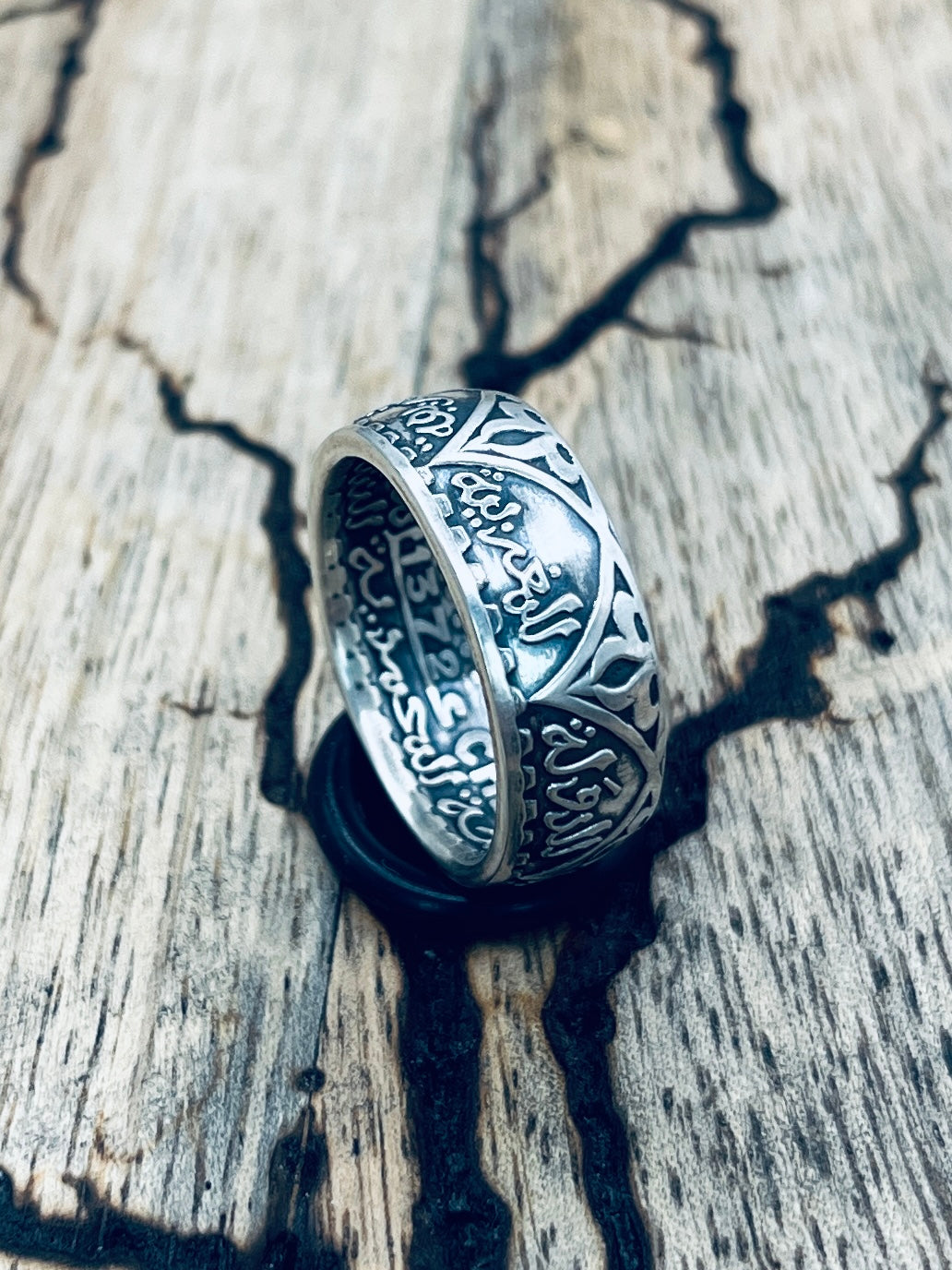 Handgefertigt aus einer alten, marokkanischen Silbermünze (200 Francs, 0,720er Silber)! Mit diesem Silberring trägt man ein Stück marokkanische Geschichte am Finger.