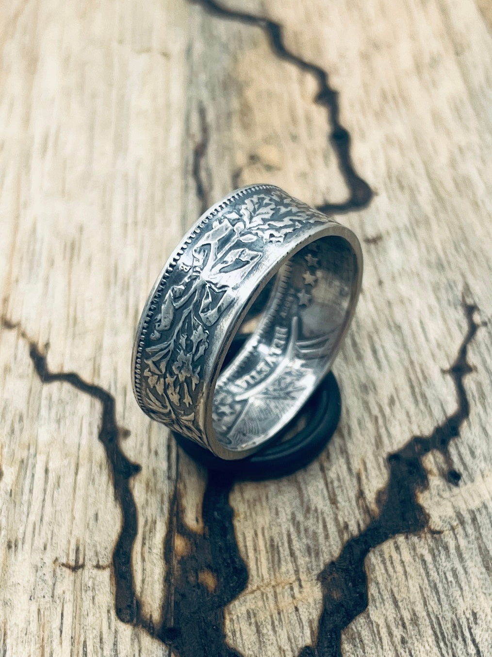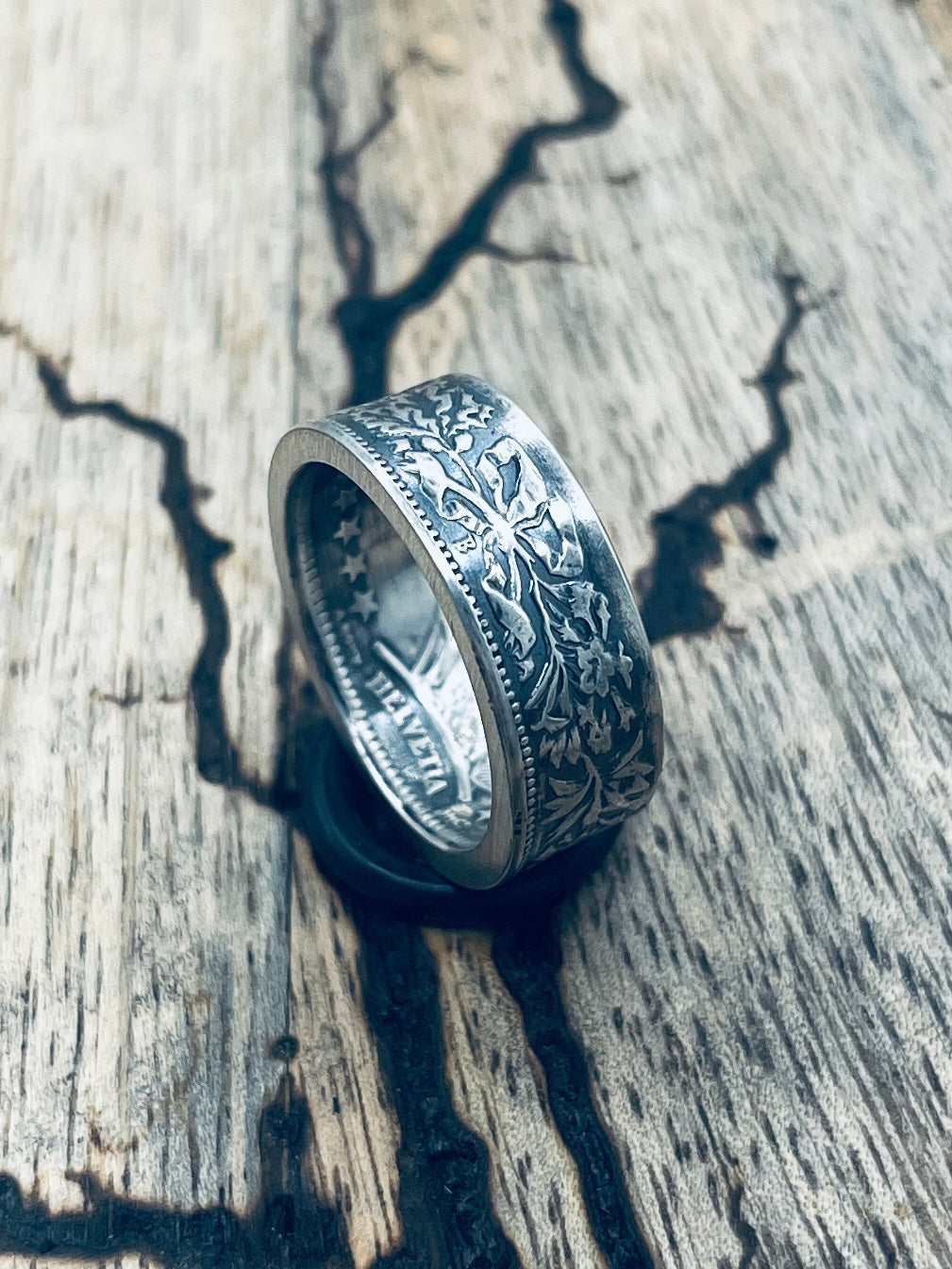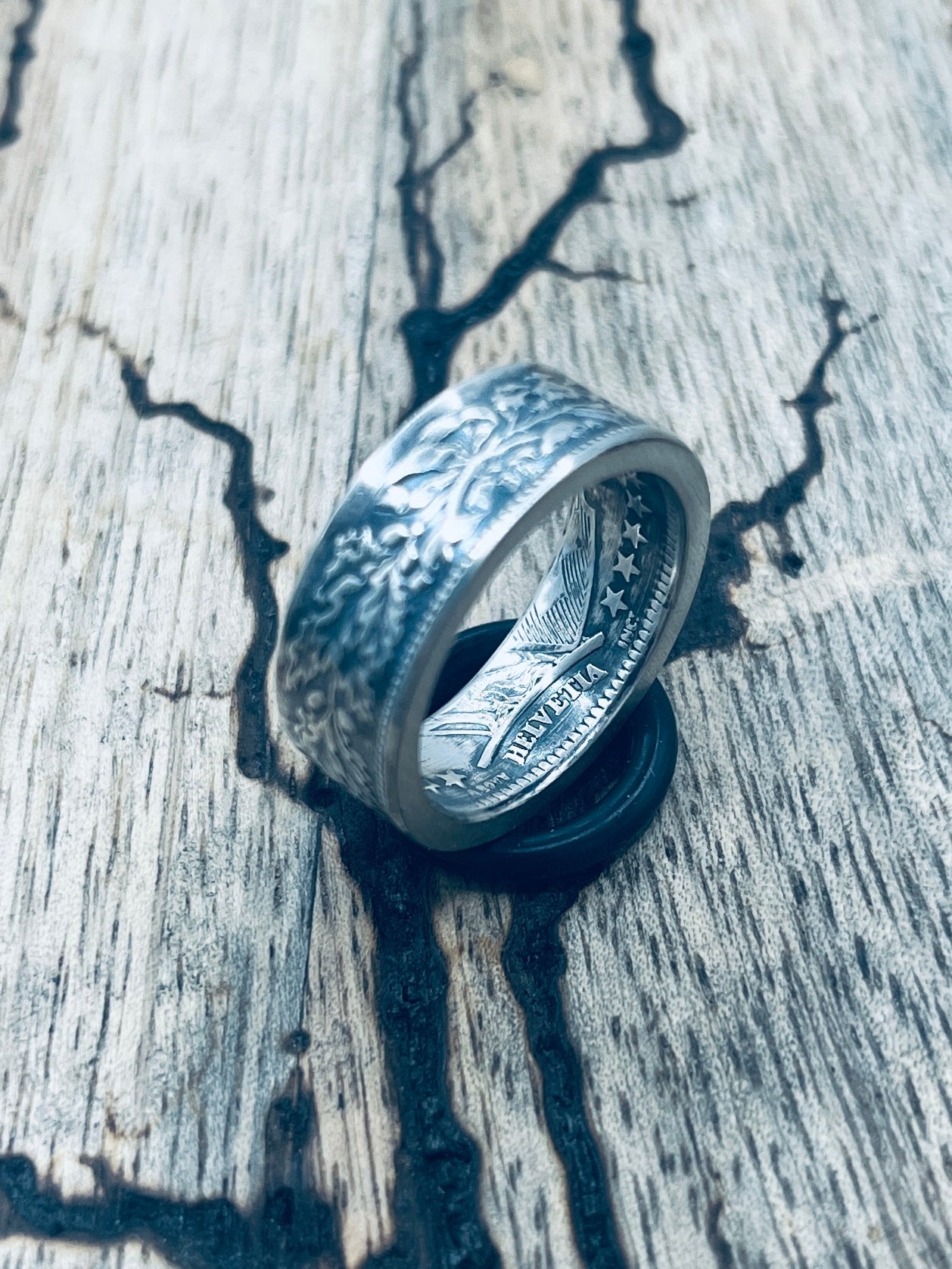 Handgefertigt aus einer alten, schweizer Silbermünze (2 Franken, 0,835er Silber)! Mit diesem Silberring trägt man ein Stück schweizer Geschichte am Finger.